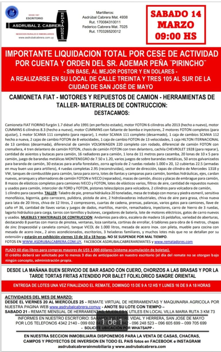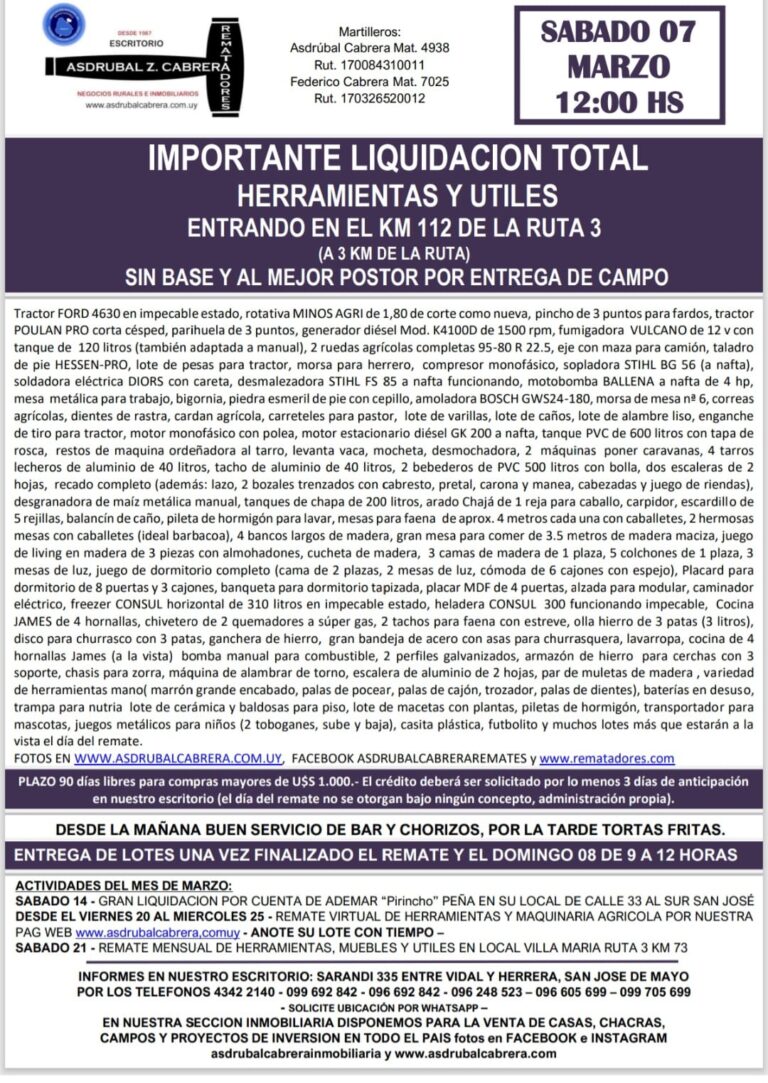 Nos especializamos en liquidaciones parciales o totales de establecimientos rurales (tambos, ganado holando, estancias, maquinaria agrícola, empresas y comercios)